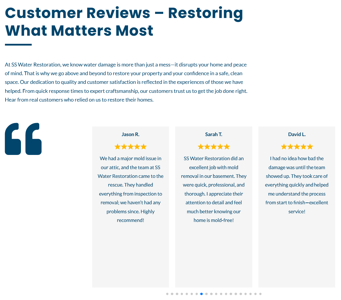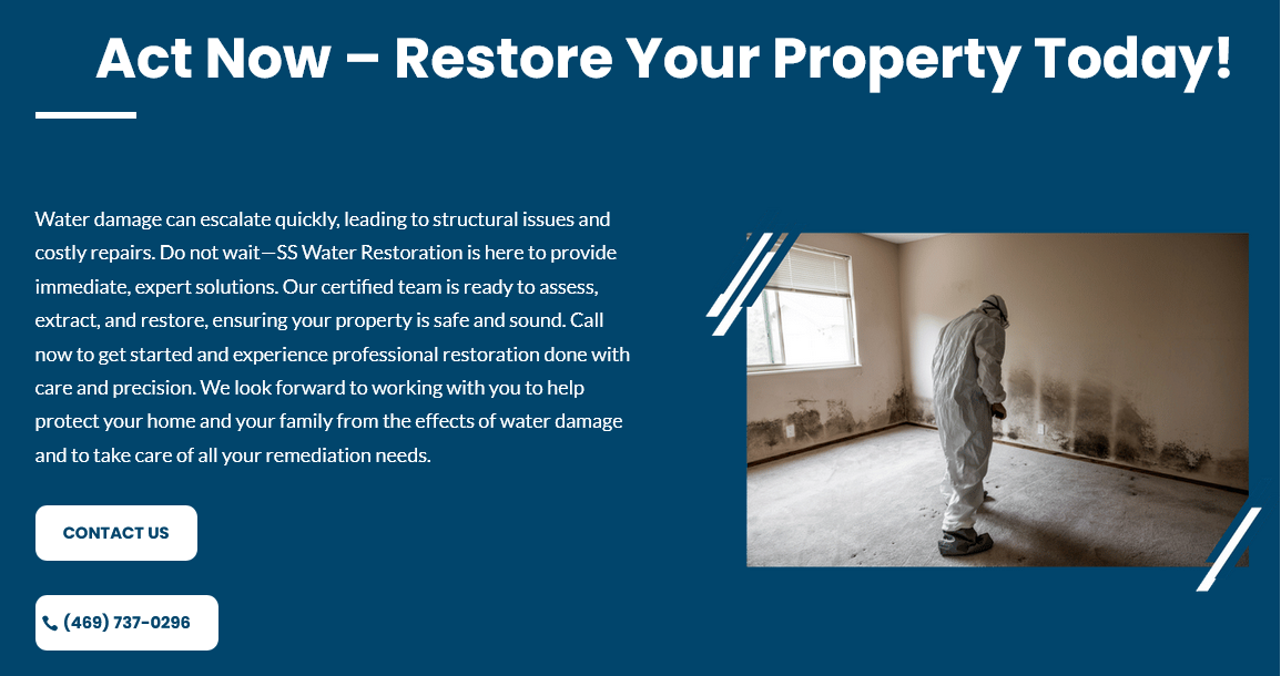 | Why Choose SS Water Restoration? When water damage strikes, you need a team that responds quickly and does the job right. At SS Water Restoration, we combine expertise, advanced technology, and exceptional customer care to restore your property efficiently. We are available 24/7 for emergencies, ensuring immediate action to minimize damage. Our certified professionals use top-tier equipment to extract water, prevent mold, and repair structural issues. We are committed to quality and transparency and guide you through every step of the process. Do not wait—call us now for prompt, reliable water damage restoration. Let us help restore your peace of mind and protect your property from further harm. |