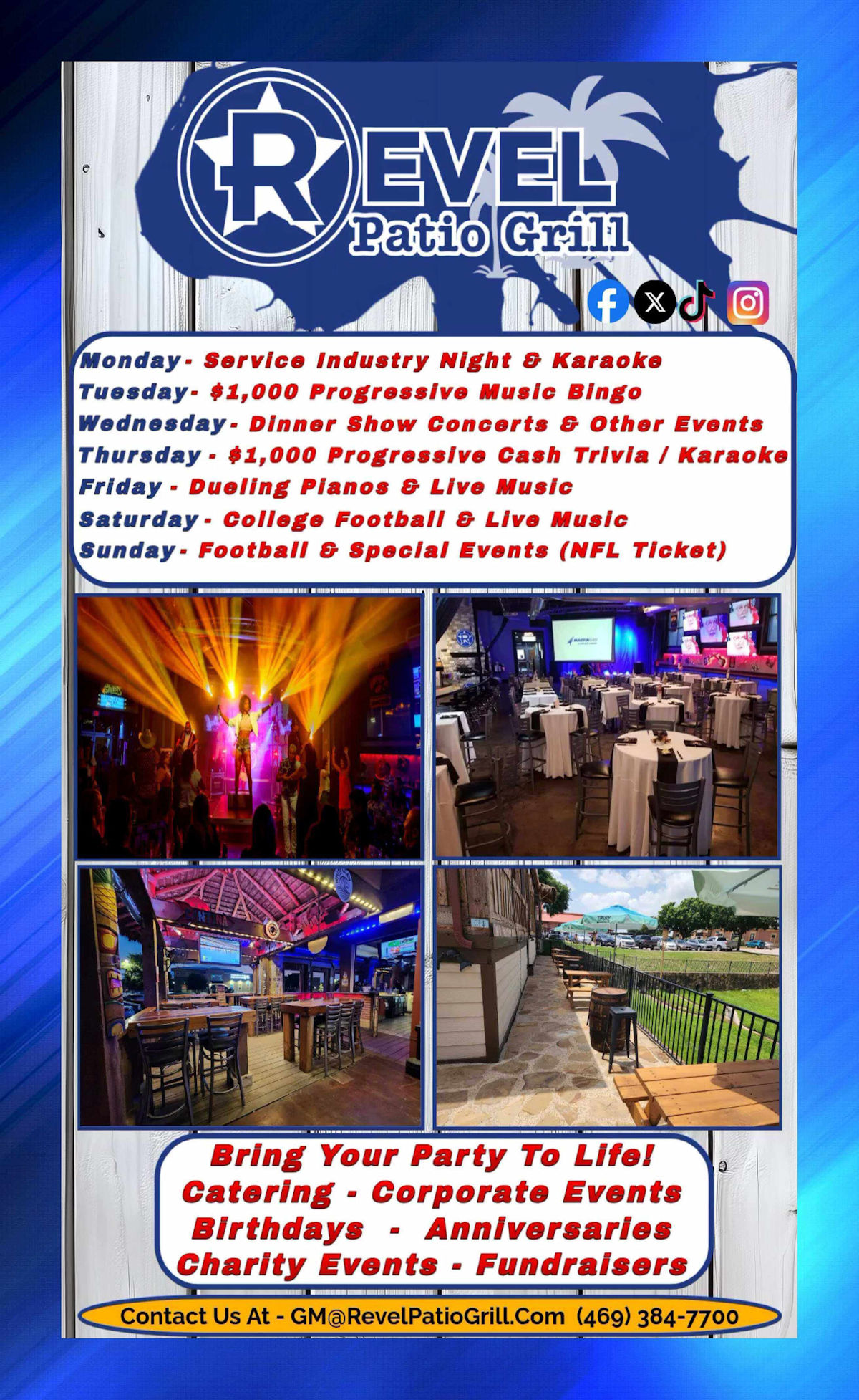 | Come join The Revel for weekly events and live music from the best bands around North Texas. |