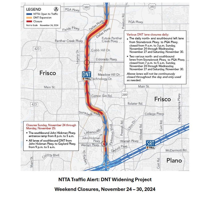 (November 22, 2024) As part of the North Texas Tollway Authority's DNT widening project, drivers should expect various lane closures in Frisco, November 24 - 27 and November 30, 2024. [See NTTA Closure Map above] and details below.