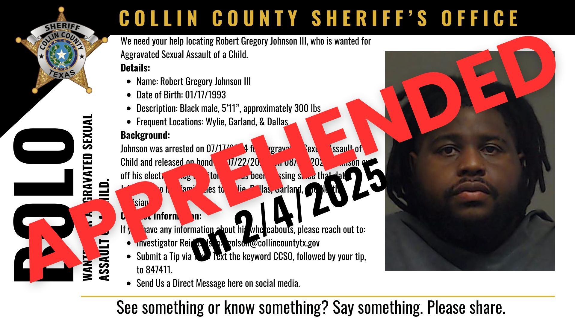 [Harris County, Texas] – February 4, 2025 – Robert Gregory Johnson III (DOB: 01/17/1993), wanted on a Collin County warrant for Aggravated Sexual Assault of a Child, has been taken into custody following a coordinated effort between law enforcement agencies and the public.