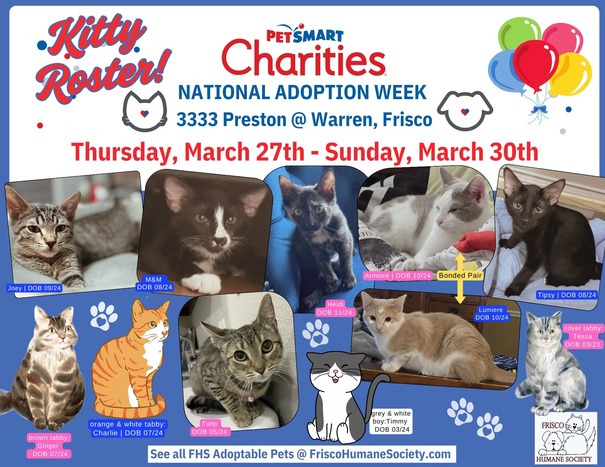 It's still PetSmart Charities National Adoption Week!!! FHS has kitties for you to meet at PetSmart today through Sunday 3/30 [at 3333 Preston @ Warren, Frisco]! We'll update this roster with any changes throughout the week based on adoptions and kitties' foster schedules (i.e., missing their foster homes). NOTE: Pictures for some of the dark-colored kitties have been lightened more than usual to try to show their coloring.