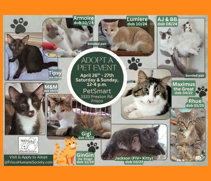 Meet your Purrfect Fur'ever Kitty(s) at this weekend's FHS Adopt-A-Pet Events at Frisco's PetSmart [3333 Preston]! Adoption Counselors will be on site Saturday & Sunday from Noon-4 p.m.
