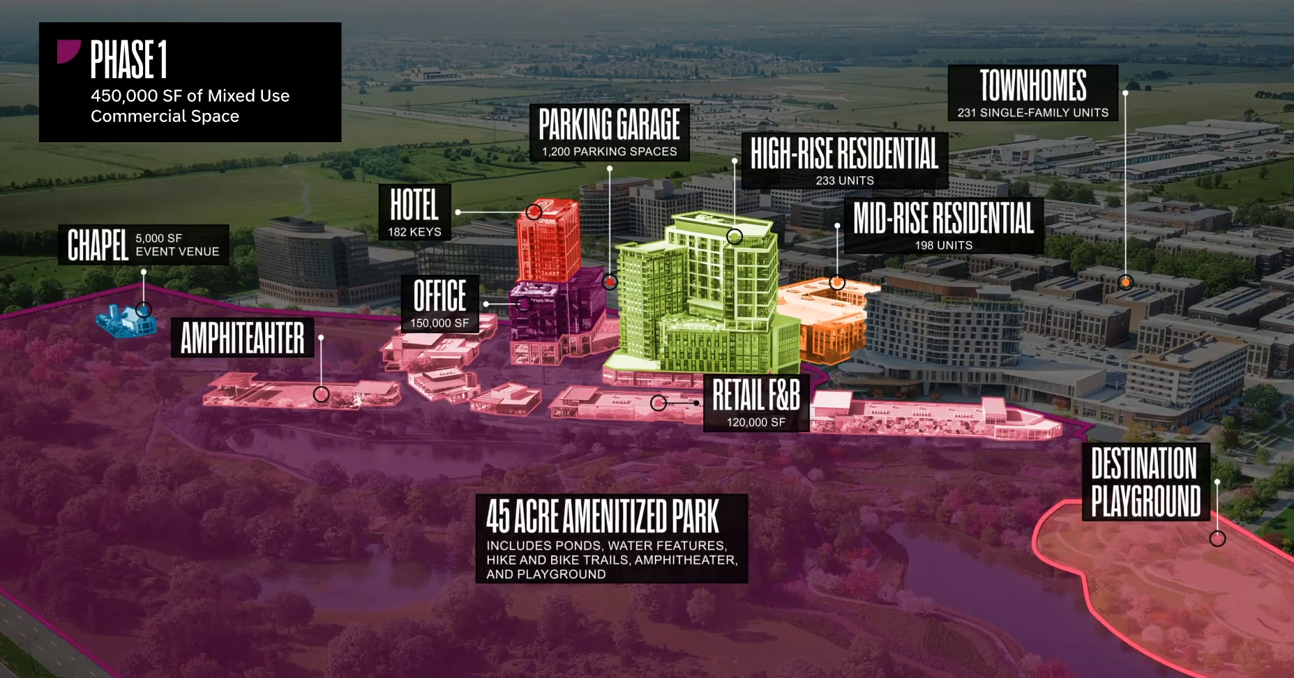 - Phase One includes townhomes, retail, amphitheater, apartments, chapel & 1,400-space garage.